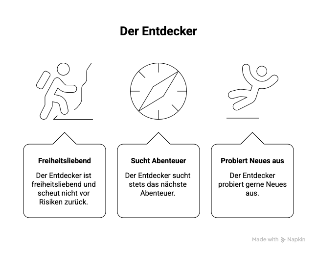 Der Entdecker probiert gerne Neues aus und sucht stets das nächste Abenteuer. Er ist freiheitsliebend und scheut nicht vor Risiken zurück.