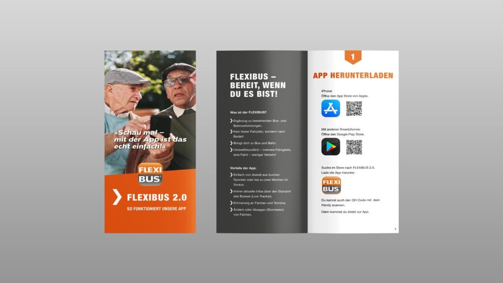 Ein Schwerpunkt war in 2025 die Einführung des App-Leitfades sowohl als Video als auch als Broschüre. Während das Video typische Anwendungsszenen zeigt, ist die Broschüre eine Schritt-für-Schritt-Anleitung von der Registrierung bis zur Buchung des FLEXIBUSSES in der App. Die Texte in einfacher Sprache wurden geliefert, wir erstellten die dazugehörigen Screenshots, das Layout der Broschüre und kümmerten uns um den Druck.